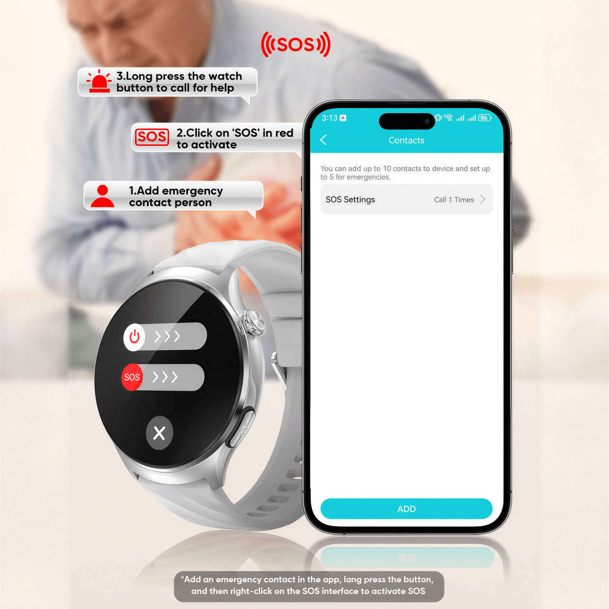 Emergency contacts can be added in advance via the app. In cases of sudden discomfort or other emergency situations, simply sliding the SOS icon on the watch will notify selected contacts, offering additional peace of mind.
