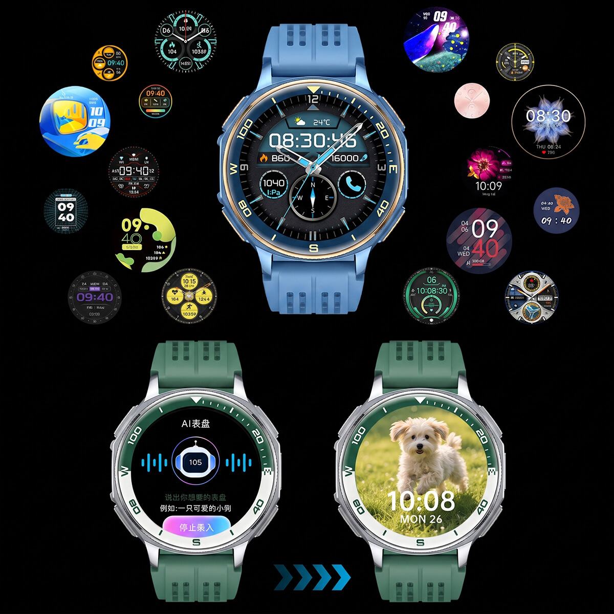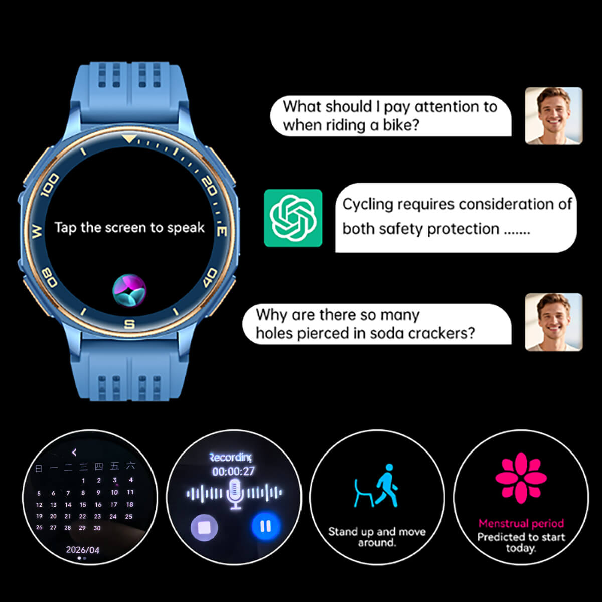 | Tools | Voice recorder · AI watch faces · Voice assistant · Remote camera · Calendar & reminders |